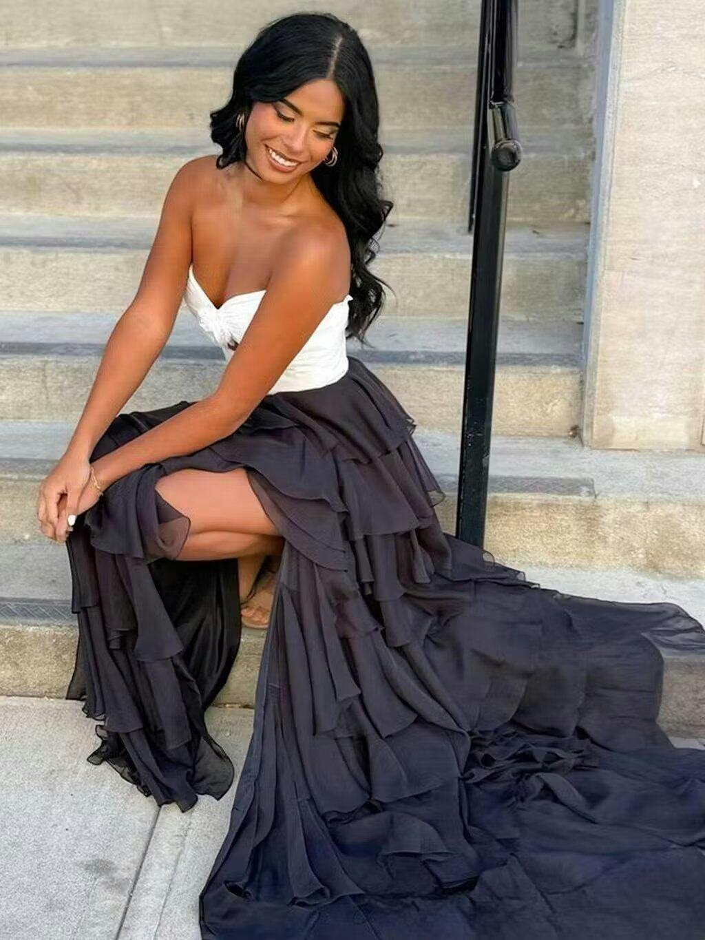 Sevoba|A-Line Strapless V-Neck Layered Chiffon Sleeveless Formal Prom Dress