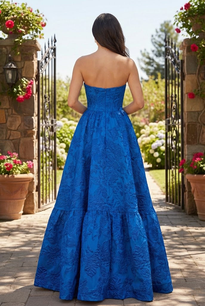 Sevoba strapless sweetheart ball gown prom dress with a corset-structured bodice that holds the shape cleanly through the bust and waist. The floral print reads soft and elevated on camera, and the neckline sits steady so you can pose and move without constantly pulling the dress up.