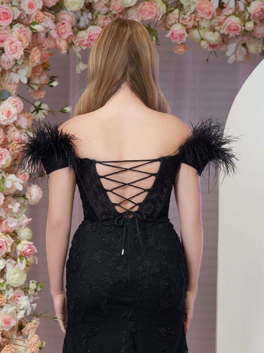 Steal the spotlight in Elaina. our Mermaid Deep V-Neck Feather Lace Long Prom Dress. This floor-length marvel is crafted from luxurious beaded tulle fabric. adorned with intricate lace appliques that bring an ethereal touch. An ideal choice for evening dresses and formal dresses. with its plunging V-neckline adds a sultry allure. perfectly balanced by the feathered off-the-shoulder straps that epitomize femininity. As you make your way through the room. the sweep train trails gracefully behind you. adding a final touch of drama. And when it's time to strut your stuff? The thigh-high slit ensures you do so with irresistible allure.