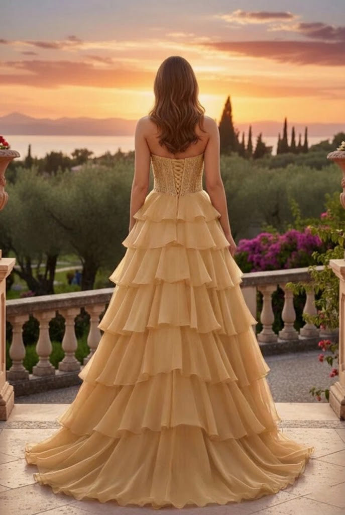 Strapless Corset Tiered A Line Prom Dress with Train | Sevoba