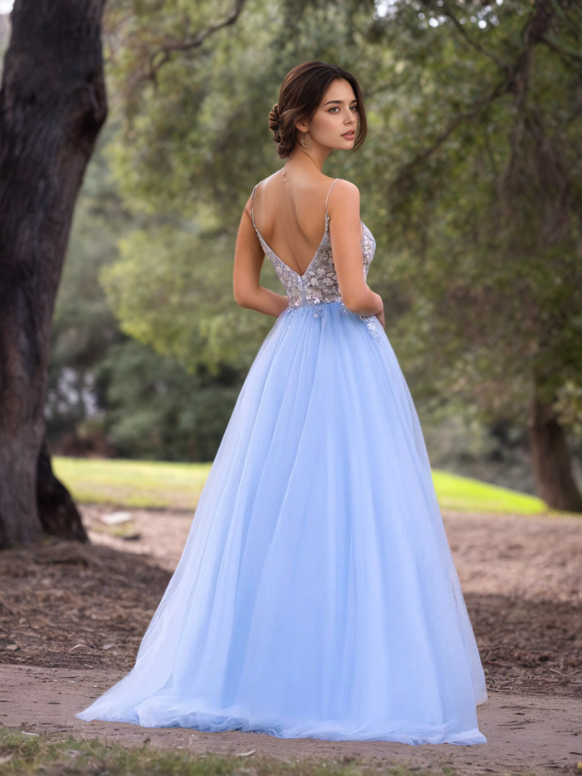 Deep V-Neck Applique Lace Floor Length Tulle Prom Dress
