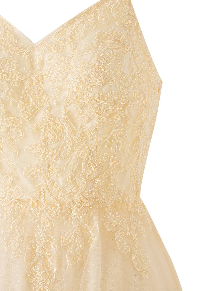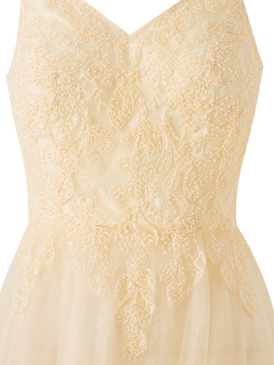 Meet dress Emily in Navy Blue. an A-line Floor Length Glitter Tulle Prom Dress that is the epitome of elegance and sophistication. Bathed in a striking Navy Blue hue. Emily steals the limelight effortlessly. An ideal choice for evening dresses and formal dresses. with its v-neckline and sleeveless design adding a subtle allure. while the floor-length glitter tulle fabric guarantees you'll shine from every angle. Adorned with appliques and sequins. this dress effortlessly marries tradition and glamour. Turn around to reveal the stunning lace-up back. a design choice that adds a classic touch while ensuring a perfect fit. With Emily. your prom night will be a dreamy affair filled with magic. glamour. and unforgettable moments.