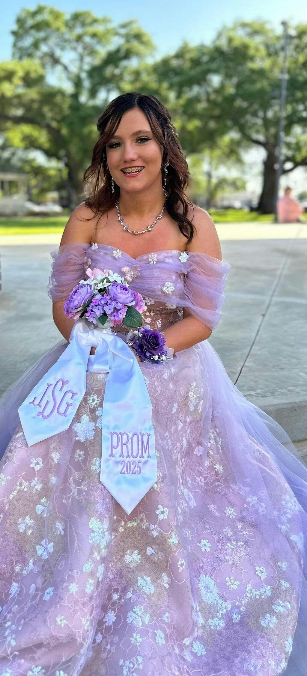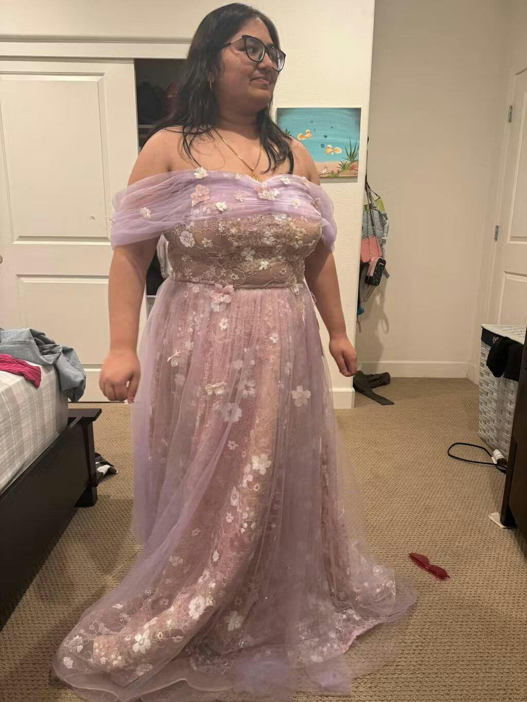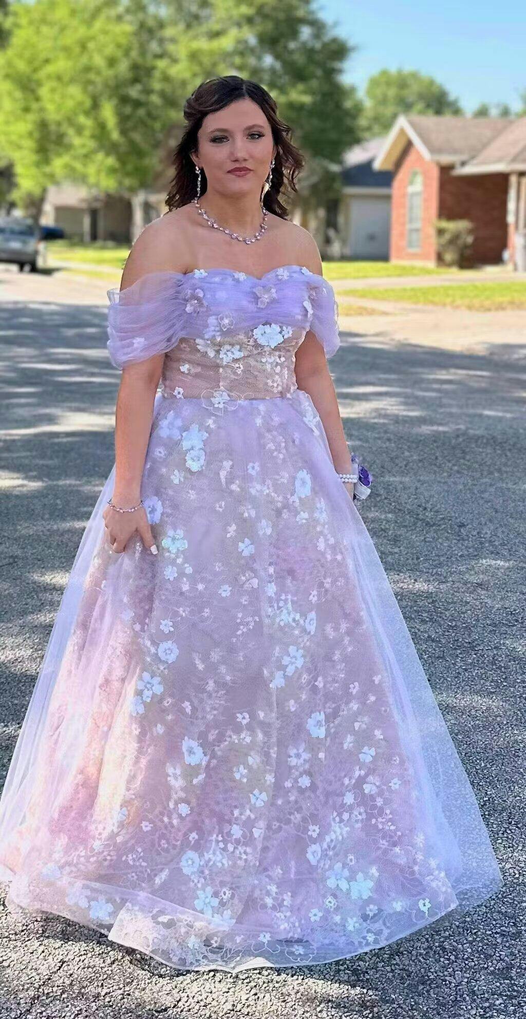 Radiate charm and elegance in the Lilac Off-The-Shoulder Tulle A-Line Prom Dress With Appliques. This breathtaking dress combines the softness of tulle with intricate floral appliques and sparkling sequins. creating a stunning ensemble that is both graceful and glamorous. The soft lilac color adds a delicate touch. making it perfect for any special occasion where you want to stand out. The off-the-shoulder neckline highlights your collarbones and shoulders. creating an alluring and romantic look. The A-line silhouette flows beautifully. skimming over your figure and creating an ethereal. fairytale-inspired look. Whether you're attending prom. a wedding. or any formal event. this dress is designed to leave a lasting impression with its combination of timeless elegance and modern flair.