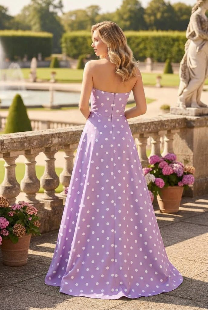 Strapless Polka Dot Bow Keyhole Corset A Line Prom Dress with Slit | Sevoba