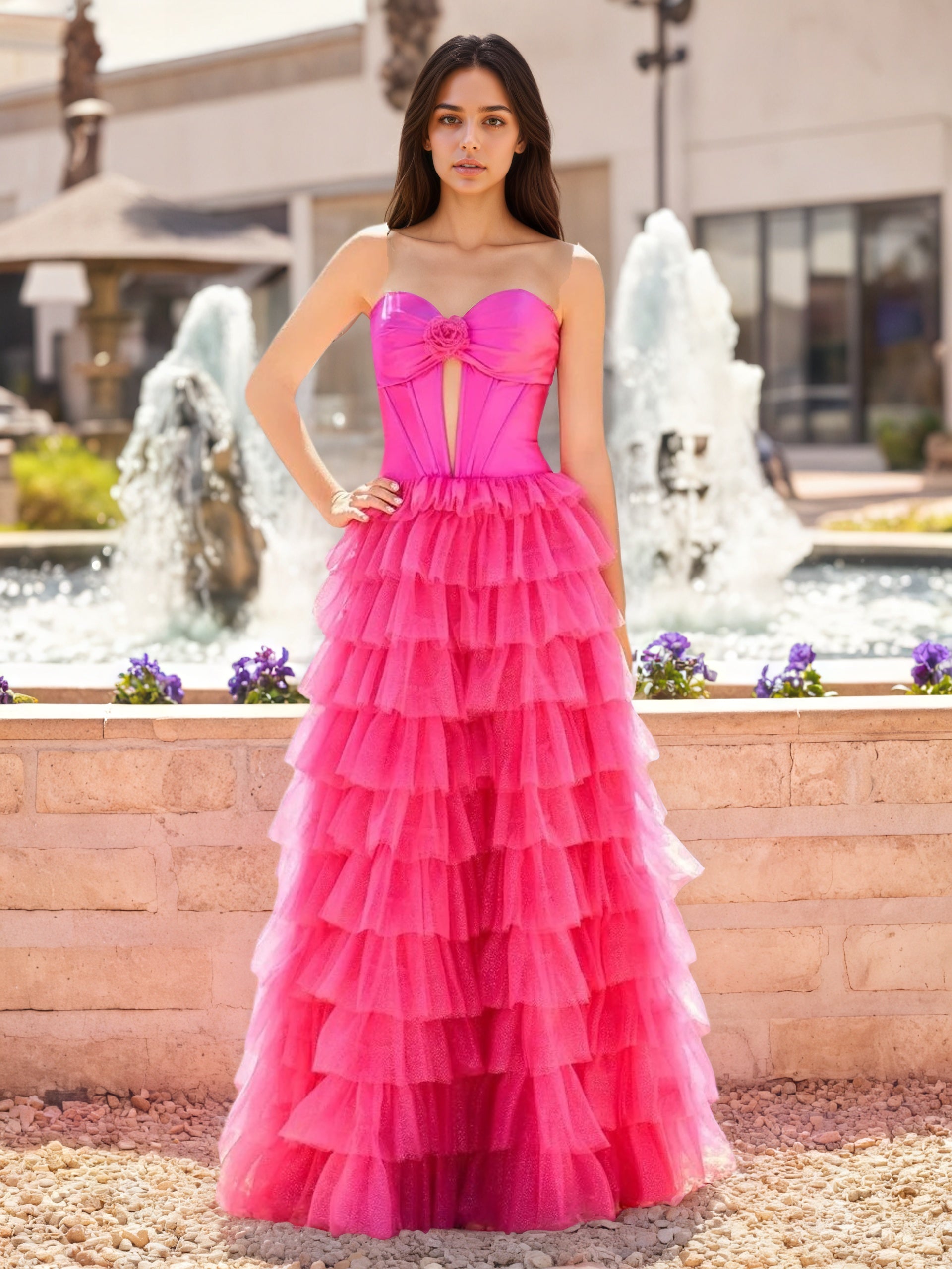 Sevoba|Fuchsia A-Line Sweetheart Keyhole Tiered Tulle Long Prom Dresses