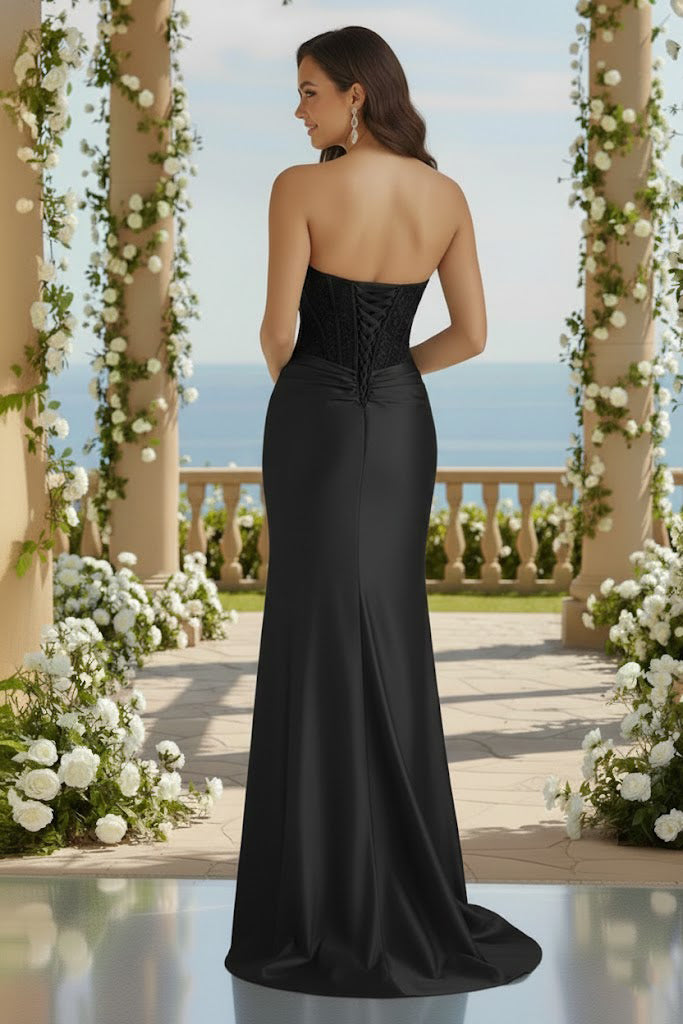 • Key Details: Beaded Illusion Corset Bodice, Sheer Panels, Ruched Hip, High Slit