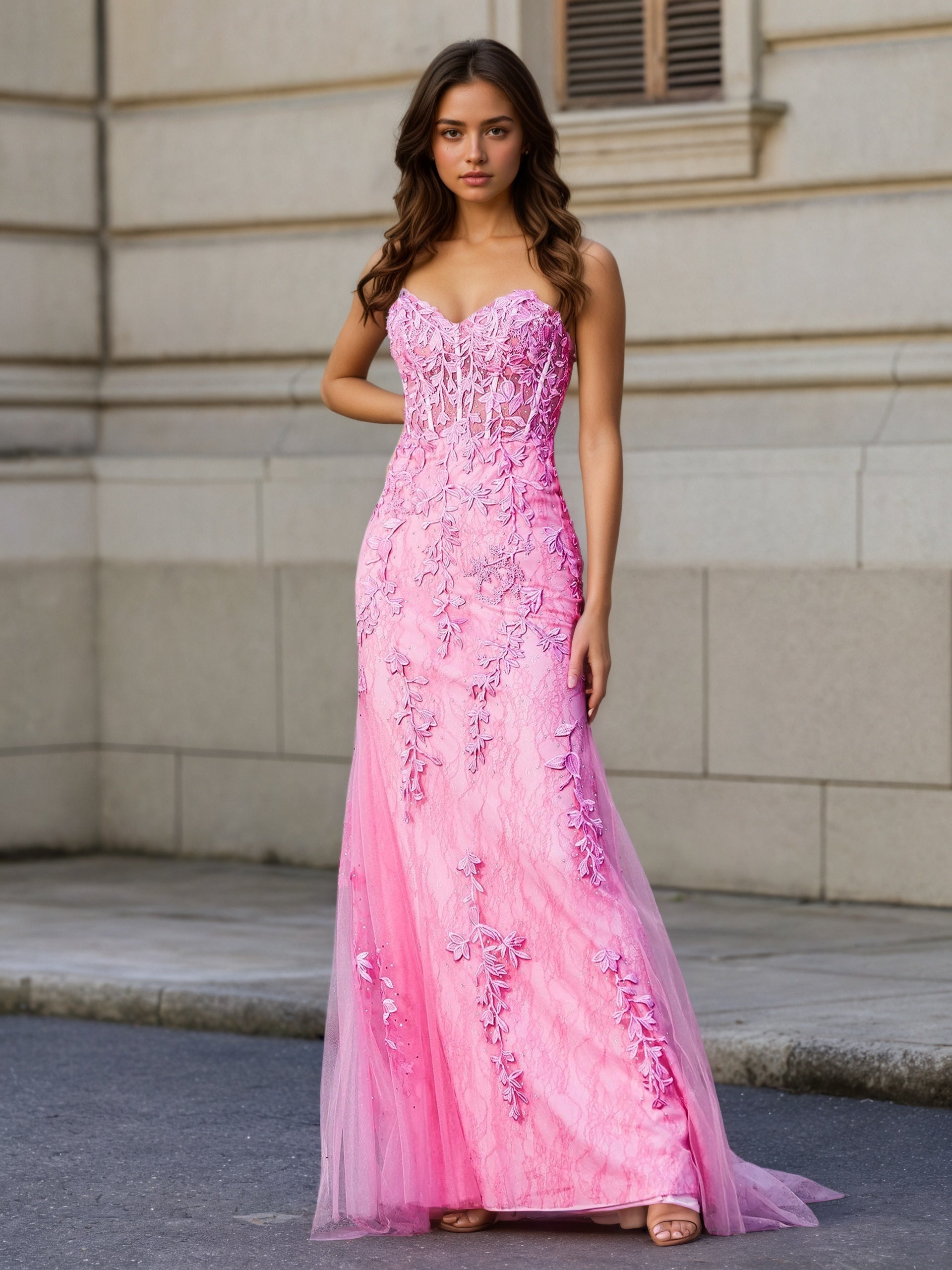 Sevoba | Strapless Lace Up Back Mermaid Tulle Gown Pink