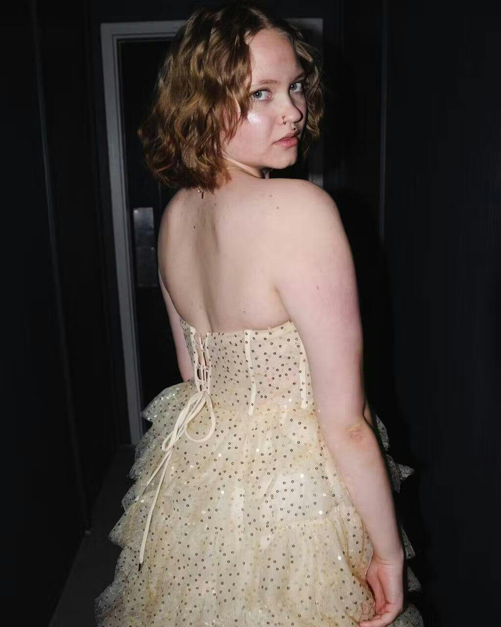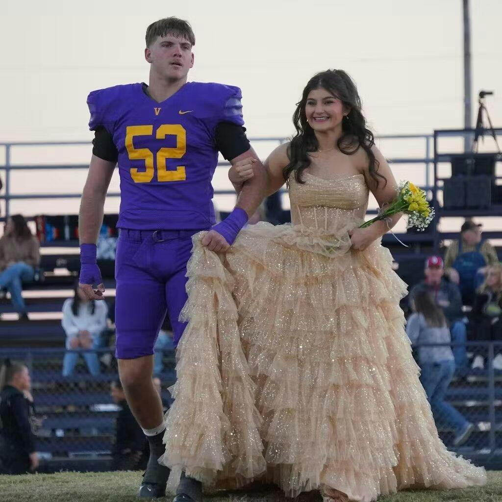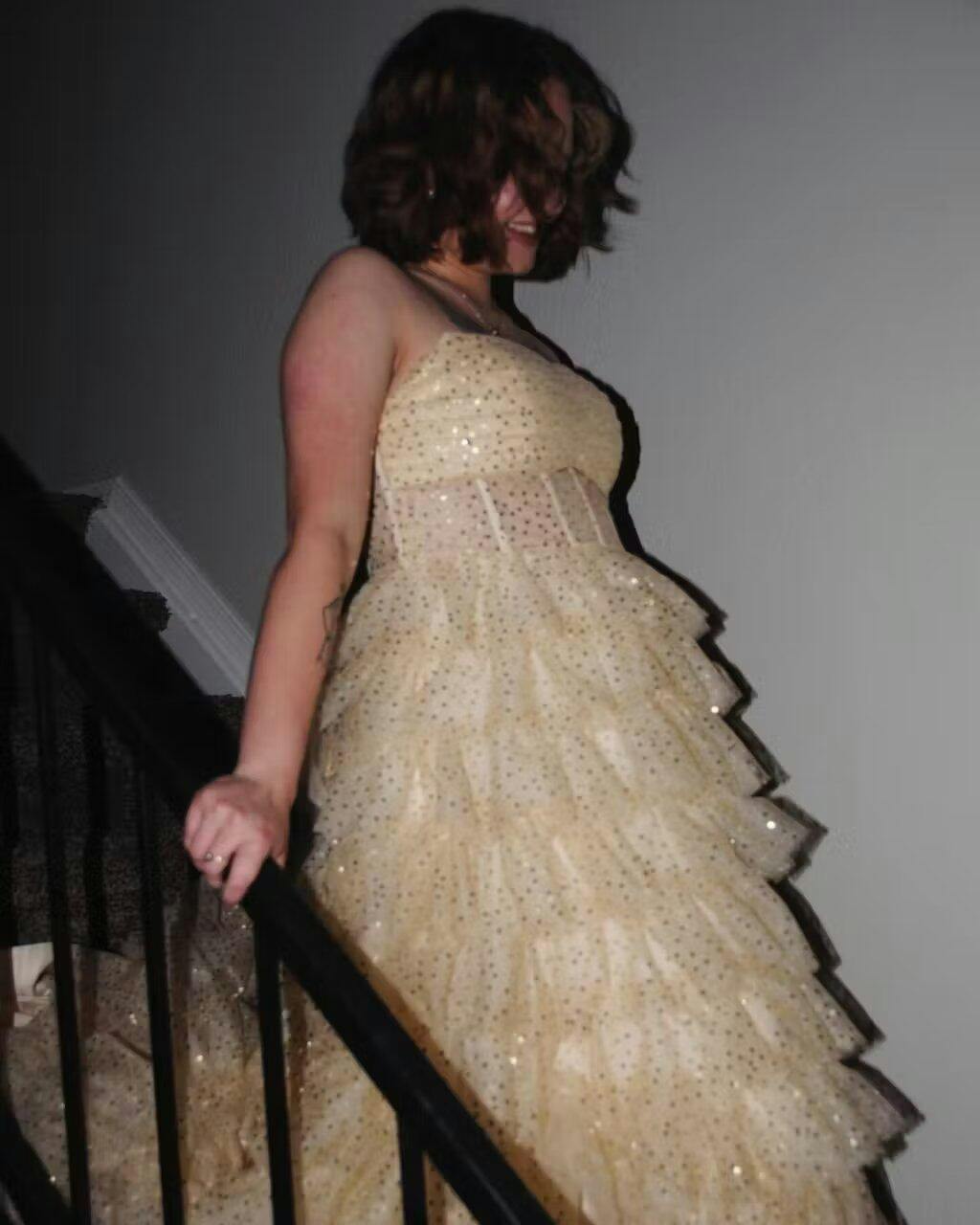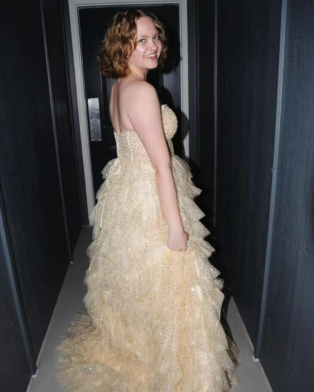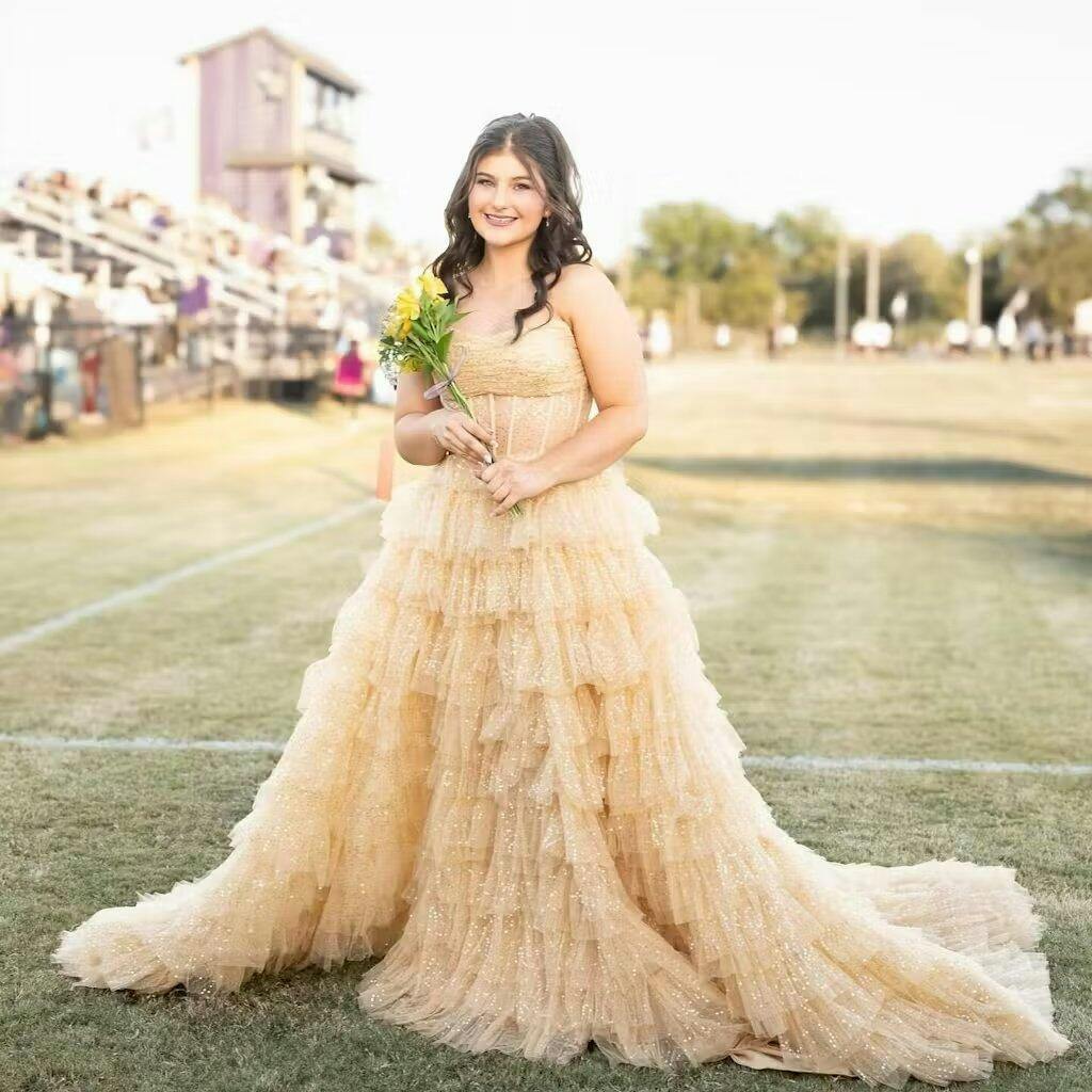 Introducing "Aubriella" – the dress that whispers tales of fairy-tale elegance and resplendent glamour. Cast in an opulent shade of champagne. every inch of this glitter tulle creation sparkles with the promise of magical nights. An ideal choice for both evening dresses and formal dresses. with its strapless neckline showcases a delicate collarbone. drawing attention to the shimmering pleats on the bust. But the star of the show? The breathtaking illusion corset bodice that fits like a dream. exuding an ethereal charm. As you sway. the multi-tiered ruffles cascade down in a waterfall of luminosity. moving with a lightness only rivaled by the stars. Completed with a sweep train. Aubriella ensures that every exit is as memorable as the entrance.