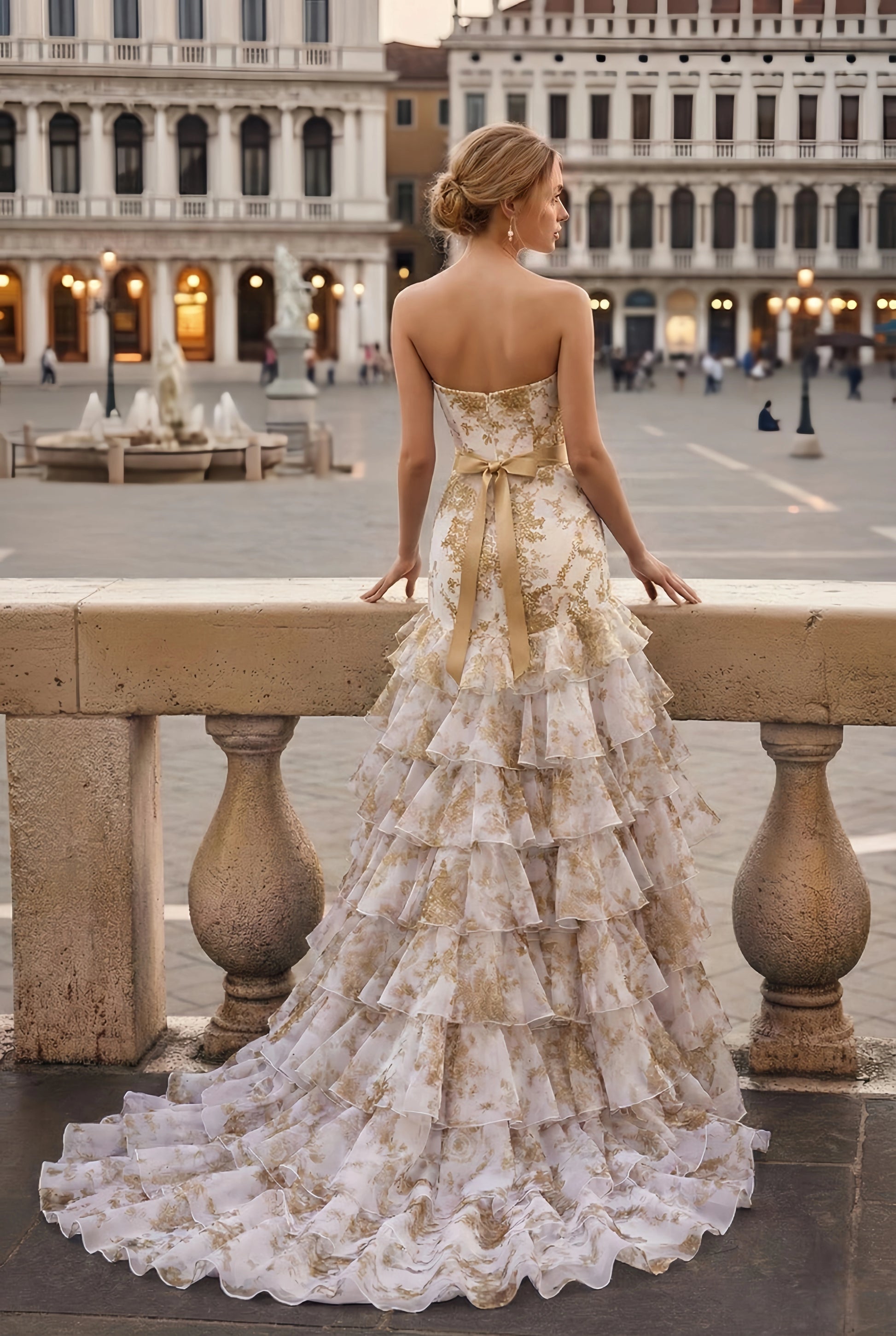 Sevoba strapless floral tiered mermaid prom dress with a clean, sculpted bodice and soft ruffle tiers that move when you walk. It is made to shine on camera, not see-through under flash, stays in place, and feels comfortable for dancing all night. The fitted silhouette hugs through the waist and hips, then flares into a tiered skirt with a light train for that entrance moment and those back-of-the-room photos.