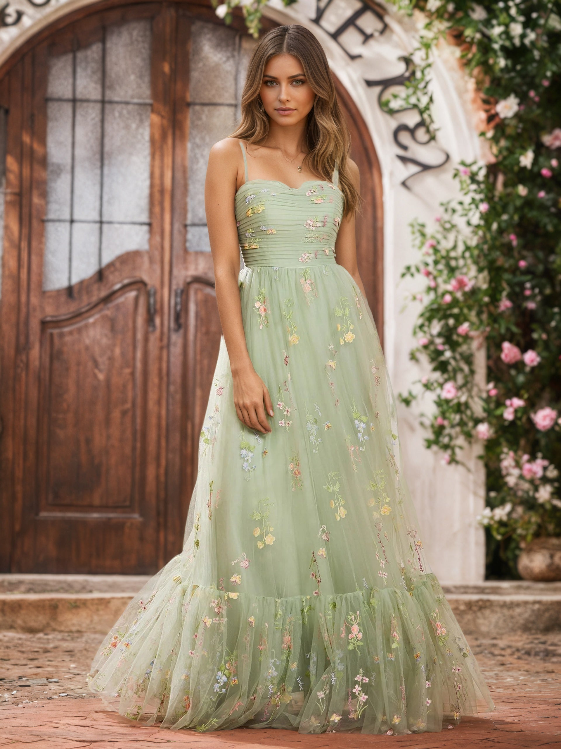 Sevoba | Sweetheart Appliqued Bodice Open Back Gowns with Shoulder Bow Dusty Sage