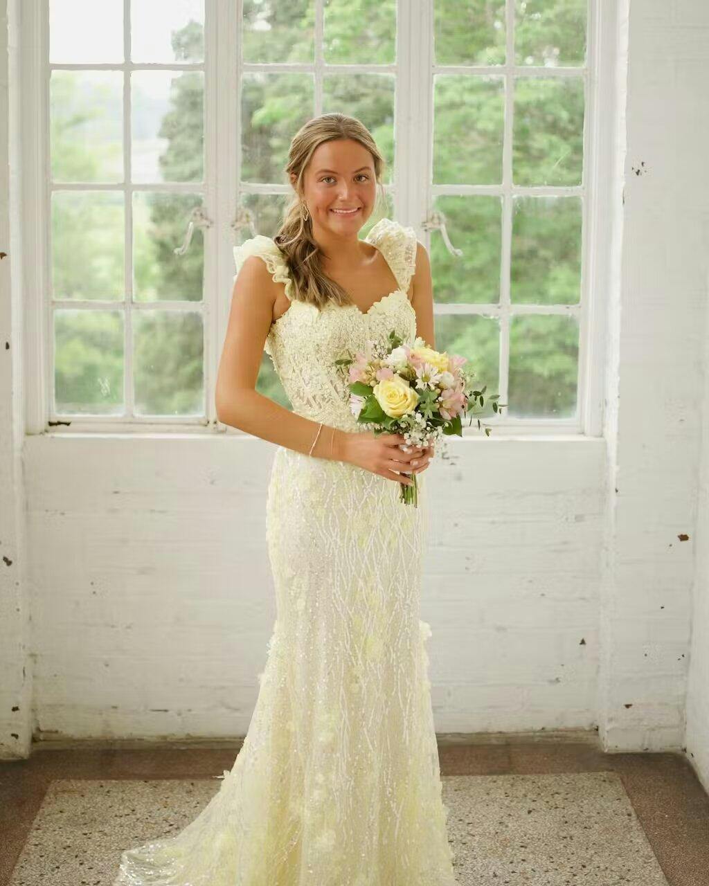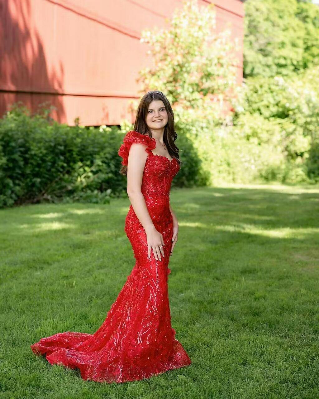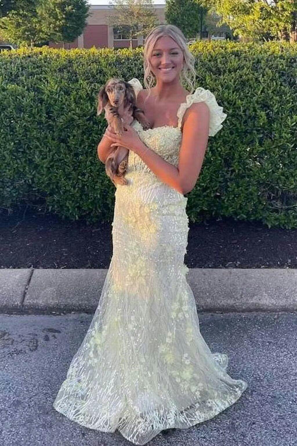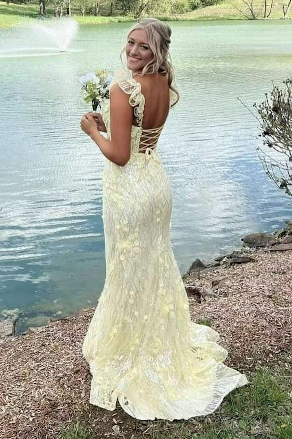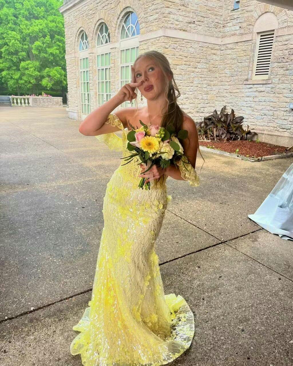 Embrace your inner beauty with the Mckinley Yellow Ruffle Straps 3D Flower Mermaid Long Prom Dress. This breathtaking dress features an enchanting sweetheart neckline that highlights your decolletage. complemented by delicate ruffle straps that add a whimsical touch. This dress showcases a mermaid silhouette that hugs your curves and flares out into a dramatic sweep train. ensuring you look elegant. The intricate 3D floral appliques add a unique and romantic element that enhances its overall charm. This dress is perfect for evening dresses. radiating charm and elegance for any special night out. For formal dresses. the Mckinley dress offers a blend of sophistication and allure. making it the ultimate choice for upscale occasions. The lace-up back allows for an adjustable fit. ensuring comfort and support as you dance the night away.